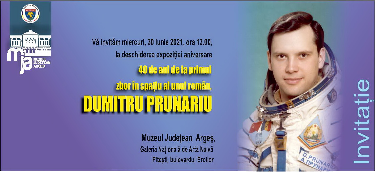 Muzeul Județean Argeș, instituție de cultură subordonată Consiliului Județean Argeș, vă invită miercuri, 30 iunie 2021, ora 13:00, la sediul instituției, intrarea din Bulevardul Eroilor, la un dublu eveniment, deschiderea  expoziției intitulată generic ” 40 de ani de la primul zbor în spațiu al unui român, Dumitru Prunariu” și de asemenea la o conferință susținută de excelența sa general (r) ing. Dumitru Dorin Prunariu.