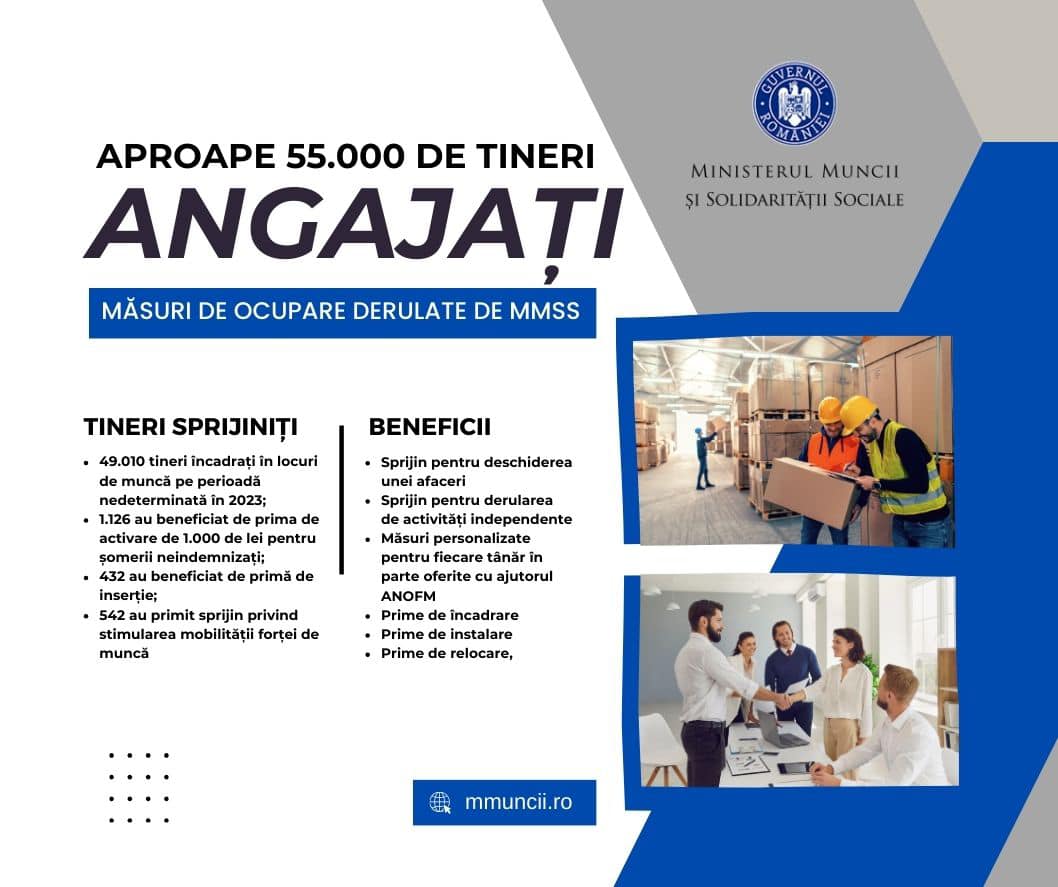 144.067 de tineri cu vârste sub 30 de ani au fost incluși pe parcursul anului 2023 în măsuri active de ocupare derulate de către Ministerul Muncii și Solidarității Sociale prin Agenția Națională de Ocupare a Forței de Muncă. Dintre aceștia, 54.759 de tineri au fost încadrați în muncă.