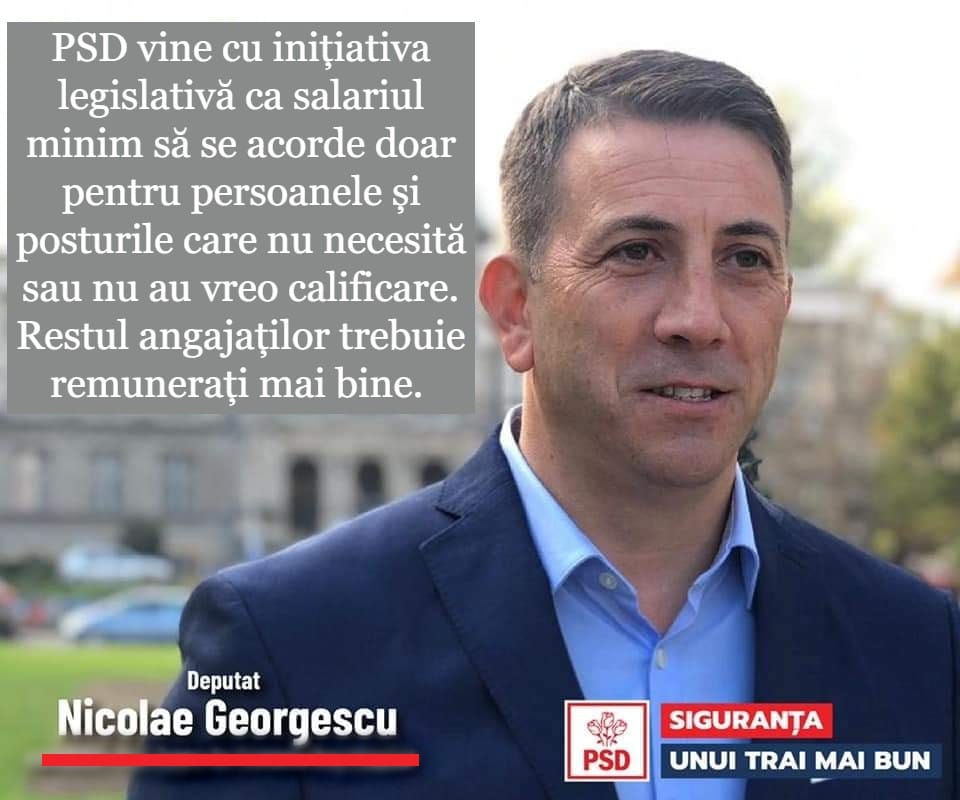 De aceea, PSD vine cu inițiativa legislativă ca salariul minim să se acorde doar pentru persoanele și posturile care nu necesită sau nu au vreo calificare. Restul angajaților trebuie remunerați mai bine. Este inadmisibil, din punctul nostru de vedere, să avem medici, ingineri, constructori, șoferi profesioniști, directori în sistemul privat plătiți cu salariul minim! Nu este normal ca o treime din numărul total de angajați din România (1,7 milioane de persoane) să primească salariul minim, deși peste 80% dintre aceștia au cel puțin o calificare.