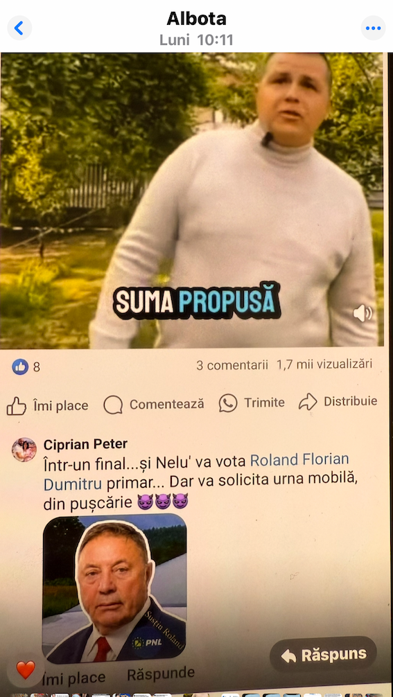 Acest Peter nici nu locuiește măcar în comuna Albota, așa că presiunile pe care le face el împotriva primarului (urmăriri, chestionări publice, filmări cu telefonul, comentarii injurioase etc.) întrunesc latura constitutivă a infracțiunii de hărțuire!