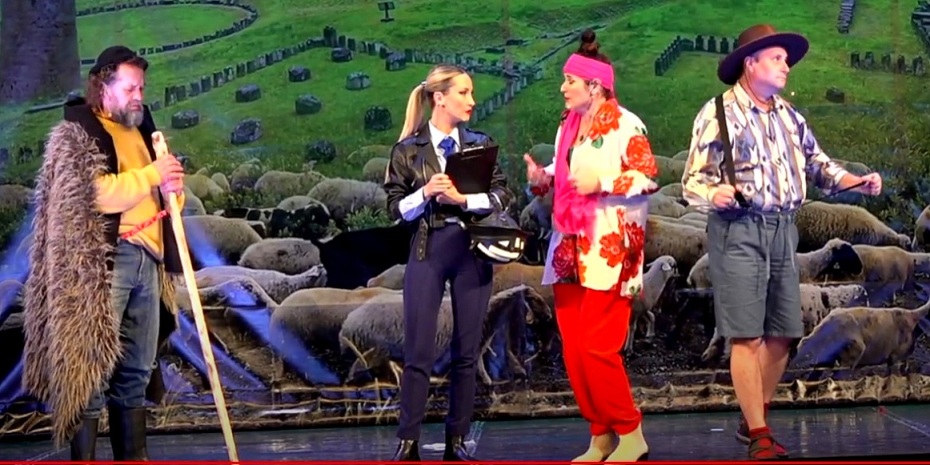 O maşinuţă cu număr ciudat şi predestinat, B99 OAE (Mulţumesc, Ramona!), ieşită-n decorul mioritic a dat iama-n mioriţele unui ciobănaş d’al nostru autohton (da’ nu cu 300 de oi, că în scena noastră abia-abia încap 4 perechi de dansatori). Şi a fost nevoie de intervenţia organului de poliţie ca treaba (şi maşinuţa, şi mioriţele) să intre pe făgaş normal. O haioasă mizanscenă simpatic prezentată de Ramona Olteanu/Ioana Podăreanu, Cornelia Niculescu/Lia Deaconu, Adrian Duță şi Puiu Mărgescu. Şi să n-o uităm pe Valeria, oiţa autohtonă, victimă inocentă a criminalei maşini, pe care poate colegii de scenă o mai plâng încă… Şi să notăm că, după câteva decenii, Teatrul Davila propune o piesă cu dubluri pe roluri.