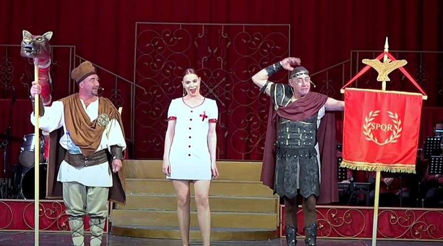 Între Lupul dacic şi Lupa capitolina pare să se fi înjghebat un fel de coabitare artistică de bun augur (nu precum în coaliţiile politice postdecembrist-capitaliste) spre hazul spectatorului piteştean hămesit de glume bune. Şi chiar mi s-a părut că actorii care i-au întruchipat pe strămoşii noştri tradiţionali au făcut un trading absolut necesar pentru studierea personajelor. Mai exact, Cătălin Mirea s-a plimbat în Forul Roman, iar Robert Tudor s-a plimbat la Deva între cele două statui ale lui Decebal… Asta a fost, ei or fi pus temeliile, că după… vorba unor cercetători într-ale (h)istoriei (h)umorului, geto-macedonii, geto-cumanii, geto-slavii, geto-goţii, geto-gepizii (cu tot cu nevestele lor), toţi au hălăduit pe plaiurile noastre şi cu toţii s-au simţit bine… Şi să nu uităm sinteza daco-romană din glasurile reunite ale celor doi actori cântând Tu Ardeal pe versuri adaptate situaţiei…
