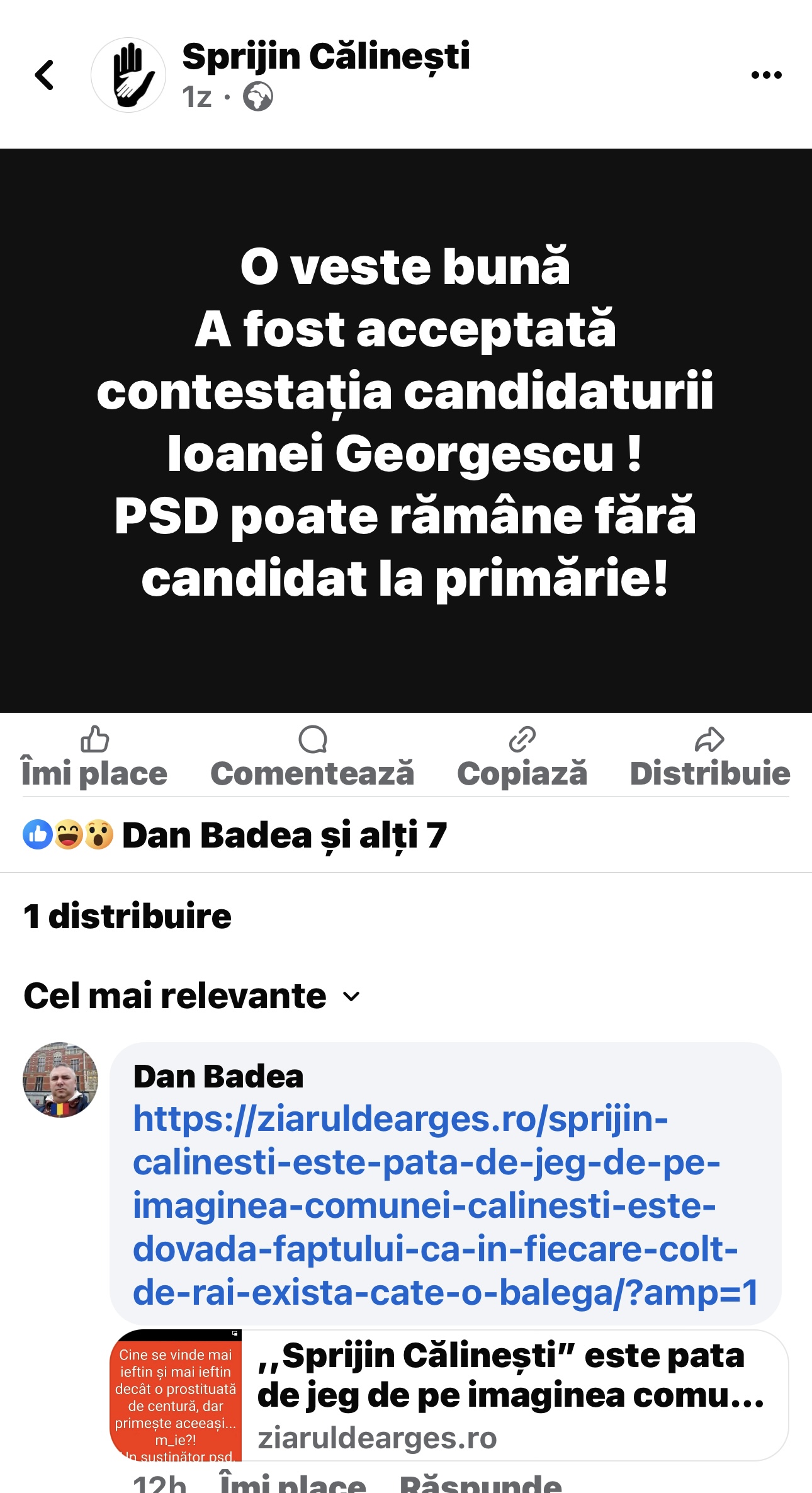 Ieri, acest cont de facebook creat pentru a minți și a-și bate joc de adevăr a anunțat că PSD poate rămâne fără candidat la funcția de primar al comunei Călinești pentru că, vezi Doamne, ar fi fost admisă o contestație împotriva candidaturii Ioanei Georgescu.