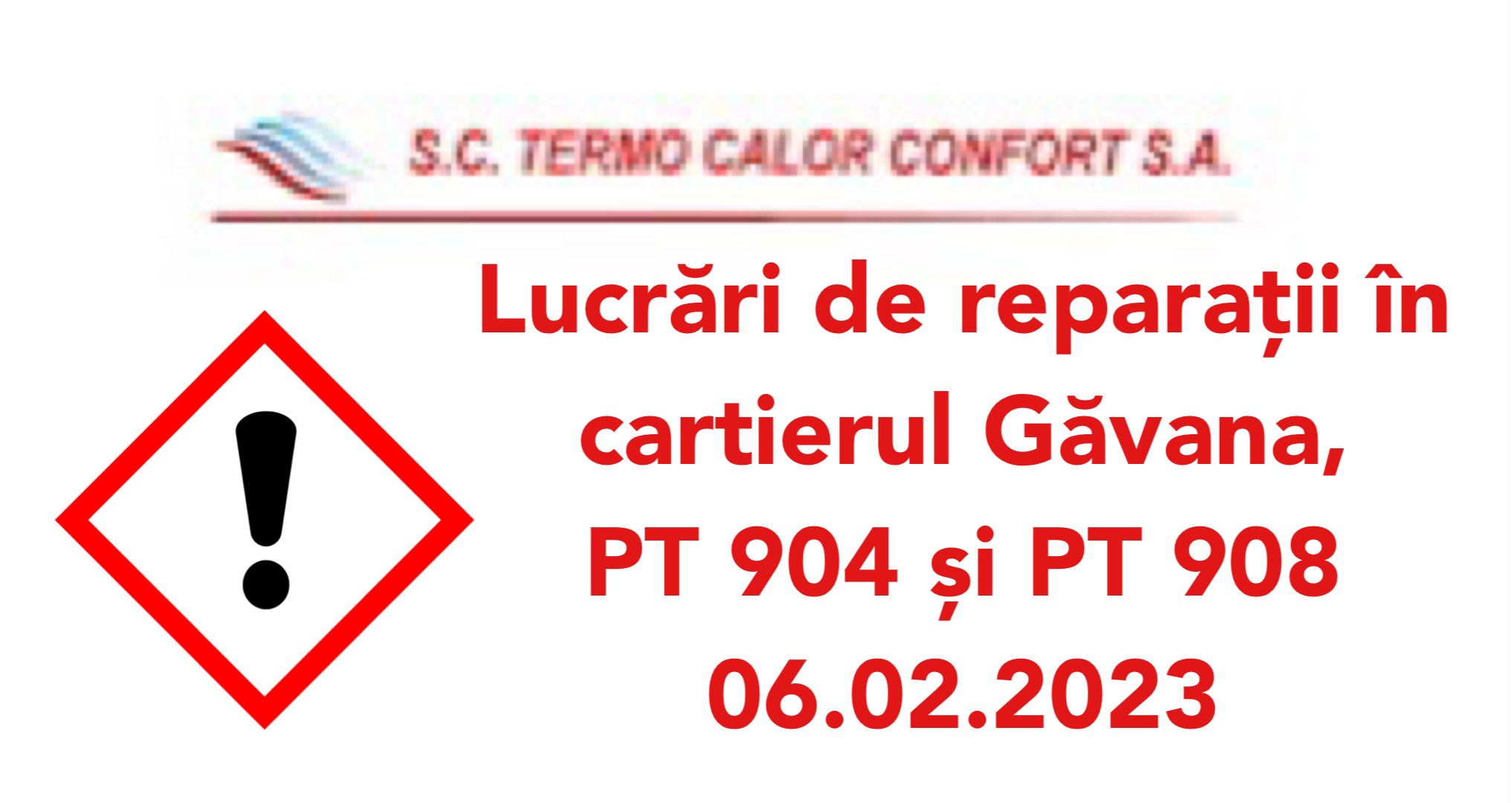 TERMO CALOR CONFORT S.A. anunță că, astăzi, 06.02.2023, până la ora 20:00, se vor face lucrări de reparaţii pe circuitul primar în cartierul Găvana şi va fi sistată furnizarea energiei termice pentru apă caldă de consum și încălzire consumatorilor alimentaţi din PT 904 și PT 908. Din cauza acestei avarii și ca urmare a intervenției pentru remediere, sunt afectați toți consumatorii alimentați din aceste puncte termice. În acest interval, echipele TERMO CALOR CONFORT S.A. lucrează pentru remedierea situației.