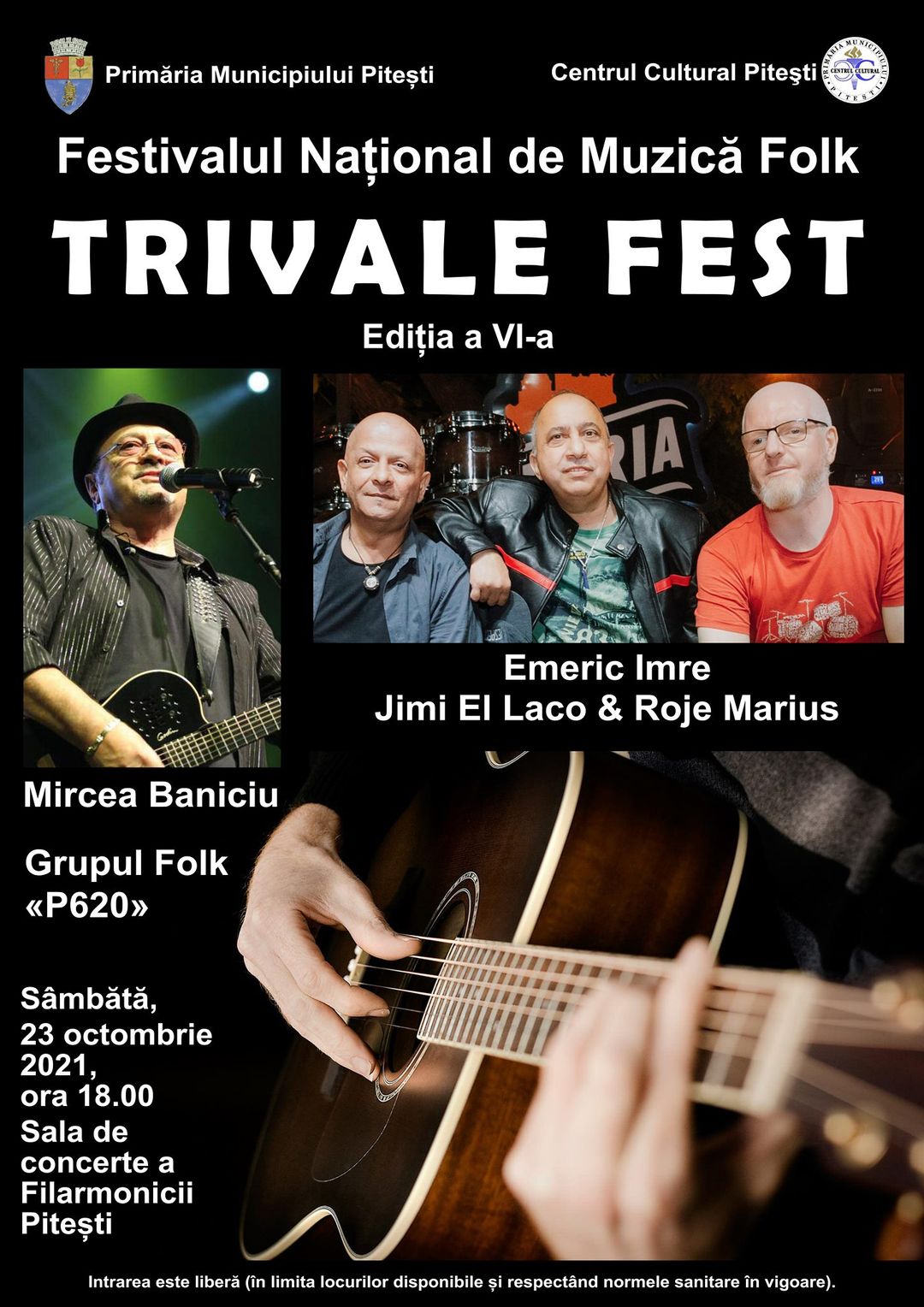 Festivalul Național de Muzică Folk TRIVALE FEST, ajuns la a VI-a ediție, care va avea loc sâmbătă, 23 octombrie, de la ora 18.00, în sala de concerte a Filarmonicii Pitești, aduce pe scenă corifei ai genului. Evenimentul va debuta cu un concurs de interpretare la care vor participa concurenții admiși la preselecție (acțiune care se va desfășura sâmbătă, 23 octombrie, la Centrul Cultural Pitești, în imobilul Casa Cărții, de la ora 10.00). Va urma un recital oferit de Grupul Folk „P620” al Centrului Cultural Pitești și Festivitatea de Premiere. Atmosfera va fi destinsă cu recitaluri extraordinare susținute de Mircea Baniciu și Emeric Imre, împreună cu Jimi El Laco & Roje Marius. Prezintă Marian Matei.