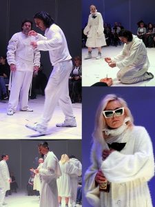 Liviu Rebreanu și Dumitru Acriș îmbină în poveste sublimul, o fecioară solară – Mădălina cu grotescul abia mascat – Puiu personaj vesel și cuceritor în exterior dar neguros și lugubru în străfunduri (dovadă multele amante care se plâng că în amorul fizic se comportă ca un ucigaș sadic). O combinație care n-avea cum să nu se termine în tragedie. A ieșit un spectacol de o duritate elegantă, rasată (aș zice asiatică), care evoluează de la discret și delicat (cu scene de voioșie temperată) la violent, grotesc și letal. Poate că regizorul a vrut să ne amintească că în lumea asta suntem toți o apă și-o (singură) culoare: albă… care cu tehnica luminilor se transformă în roșu jucăuș sau ucigaș, în violet lugubru… iar echipamentul de lucru – uniforma albă al tuturor personajelor și lumina care scaldă democratic scena cu tot ce suflă în ea, actori și spectatori adaugă câteva grade la atmosfera și așa apăsătoare. Tensiunea este constant prezentă, și se amplifică în secvența dansului Ciulendrei, iar strangularea Madeleinei pare un ritual japonez (un fel de kill Madeleine). Alunecarea în hybris a lui Puiu Faranga provoacă exercițiul de catharsis (după modelul stagiritului Aristoteles) al spectatorului (colectiv). Regizorul ne aduce împreună prin lumina roșie care inundă toată scena (cu spectatori cu tot) într-o comuniune vinovată cu asasinul Puiu. Aproape că mă întreb ce m-a oprit să fac 3 pași să-l iau de guler pe asasin și să-l întreb ce poftești măi musiu, lasă fata în pace!… Și chiar vreo câteva momente m-am simțit vinovat că n-am făcut-o (și sper că nu sunt singurul spectator care am simțit așa ceva…)