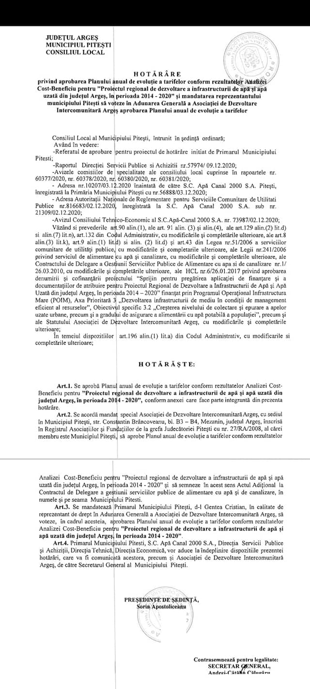 Din respect pentru piteșteni, dau replică postării mincinoase a grupului politic Gică – Contra (a se citi PNL-USR) din consiliul local al Piteștiului: ceea ce au votat în 23.12.2020 – HCL 432 se respectă întocmai! Nu știu la ce și cui folosește dezinformarea, însă piteștenii sunt mai inteligenți decât îi consideră ei și pot verifica adevărul! Tariful se majorează cu 6% la apă și 6% la canalizare, exact cum au votat ei!