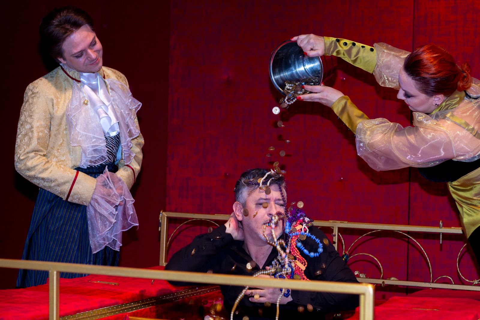 Ora: 19.00 – VOLPONE – „Volpone” este un spectacol care devoalează o lume excentrică, plină de exuberanțe și de perversitate rafinată. Este lumea celor care pentru a-și păstra iluzia puterii, sunt în stare să vândă atât sufletele lor, cât și pe ale altora. Personajul Volpone este singurul care este lucid. El are abilitatea să jongleze cu slăbiciunile celor vânduți banului. (TEATRUL ”ALEXANDRU DAVILA”- Sala Studio “Liviu Ciulei”).