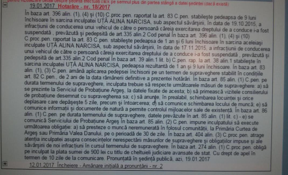 Ei bine, din luna ianuarie a acestui an, penală cu acte în regulă este nimeni alta decât nevastă-sa, Uță Alina Narcisa. Prin hotărârea nr. 18 din 19.01.2017, Judecătoria Curtea de Argeş a condamnat-o pe INCULPATA Uță Alina Narcisa la pedeapsa de 9 luni închisoare pentru că, în data de 19.10.2015, sus-numita a fost depistată în timp ce conducea un autovehicul pe drumurile publice având permisul suspendat! De asemenea, instanţa a condamnat-o pe Uță Alina Narcisa la pedeapsa de 1 an şi 9 luni închisoare pentru că, în data de 17.11.2015, conducea senină maşina cu toate că avea deja permisul suspendat şi, mult mai grav, avea deja un dosar penal pentru conducere fără permis!